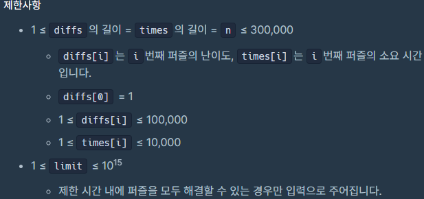 1. 퍼즐 문제를 제한시간 안에 해결하기 위한 숙련도의 최소 값 구하는 문제